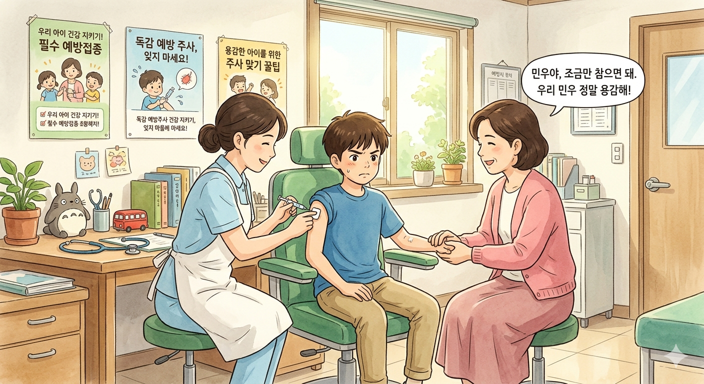 보호자(부모) 동반하여 방문 → 예진표 작성 → 의사 상담 → 1차 접종